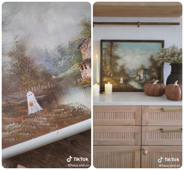 The idea involves painting a tiny ghost (or several ghosts) on vintage art. In their video, the content creator used a woodsy scenery painting from the thrift store. At home, they used acrylic paint to add two little ghosts to the scene. They even added a jack-o-lantern candy bucket to one of the ghosts, as if it were trick-or-treating.