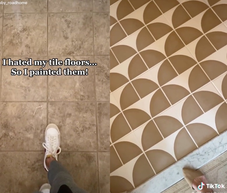 They start out by showing us how they paint their original drab tile flooring with two coats of primer, followed by two coats of a base color. They chose a soothing beige, but this can be adjusted to your liking. After that, they use a quarter-circle stencil to create a repeating design, first tracing with pencil and then hand-painting those outlines light brown. Once again, the color choice here is up to you, though these natural hues help achieve the classic clay tile look.