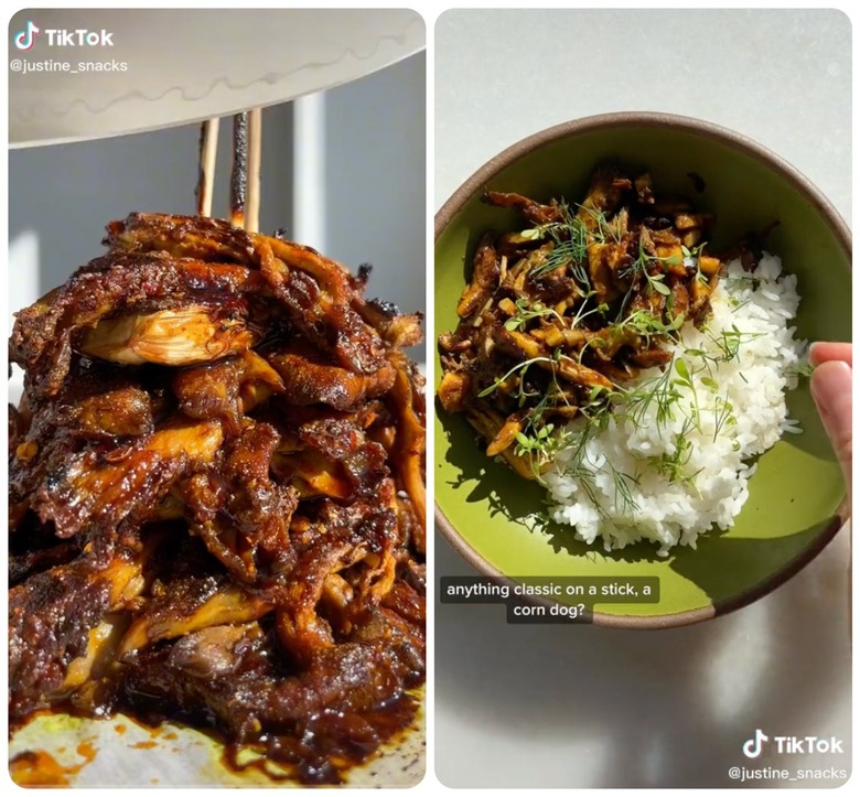 Prepping the oyster mushrooms is the most difficult part of this recipe, but truthfully, it's not too much of a challenge. Doiron recommends pulling apart the mushrooms, drizzling them with olive oil, and cooking them in a pan with a grill press on top to remove any moisture.