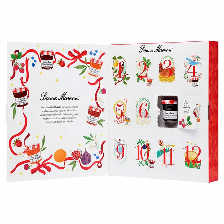 This calendar has 11 mini jars of fruit spread and one mini jar of honey.