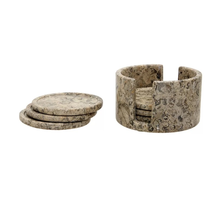 These hand-crafted coasters and accompanying holder are perfectly weighty.
