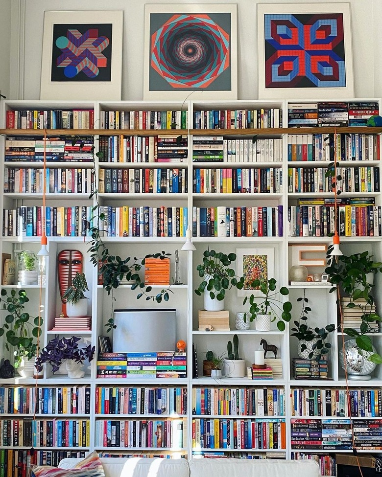 Instagrammer @fabriksen has made use of their entire wall and does not shy away from color. Enhancing the already-bright hues of the book's spines, they incorporate vibrant artwork to bring out even more of the color, creating a sort of organized chaos.