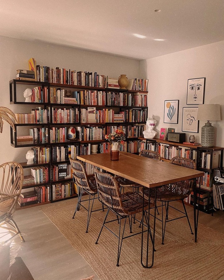 Cátia Vieira stores her books in her dining room, utilizing two adjoining walls. However, the most intriguing part of the setup is the shape of the larger bookshelf that looks like interconnected cubes, making the physical shelf just as stunning as the books living on it.