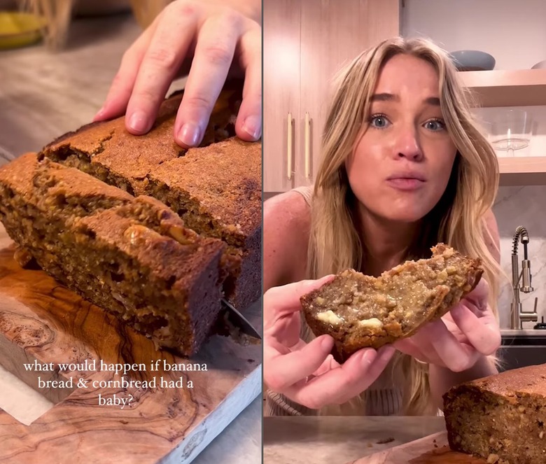 "What would happen if banana bread and cornbread had a baby?" Traeger asks at the beginning of her video. She then shows us step-by-step how she prepares the banana cornbread loaf along with the honey caramelized walnuts that she adds to the dough, and the salted honey butter she spreads over a warm slice fresh out of the oven.
