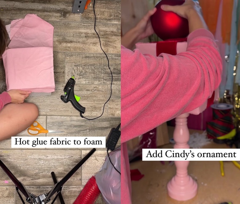 Calling their creation "Grinch and Cindy Lou Centerpieces," Waldo shows us how they spray-paint two candle pedestals bright green and light pink. From there, they use hot glue to cover two eight-inch foam blocks in red and pink cotton fabric respectively. Next comes thick red ribbon, hot glued around the sides of each of the blocks to create the illusion of wrapped presents.