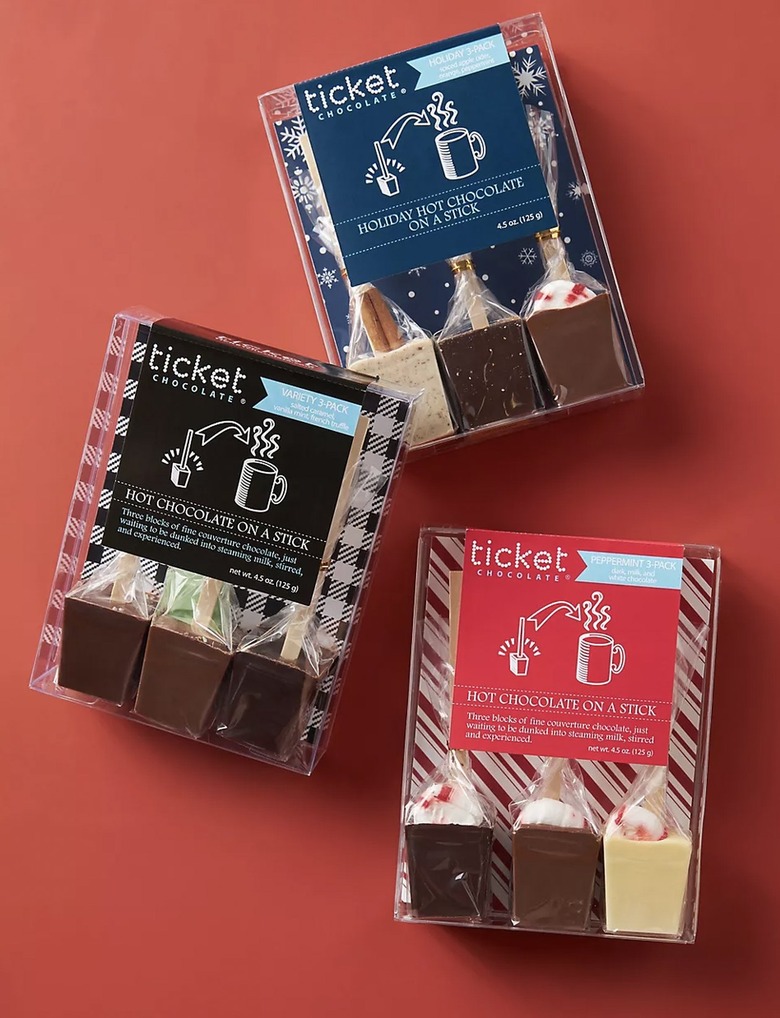 Made with couverture chocolate, this Ticket hot chocolate on a stick set is filled with an array of sweet and delicious flavors. There are three sets to choose from: a holiday pack that includes spiced apple cider, a peppermint pack, and a variety pack that includes French truffle.