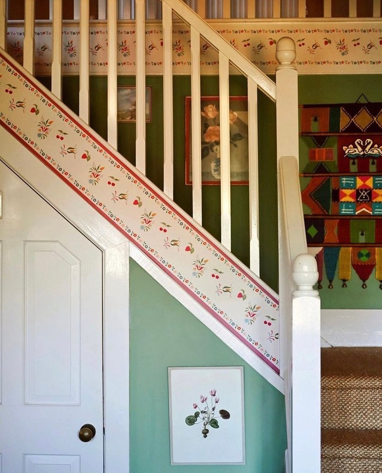This border design by Tess Newall adds the perfect accent to an already-colorful stairway. Inspired by an 18th-century French textile, the composition has been reimagined as a wallpaper and border design. It's hand-painted and elicits a folk-like appeal.