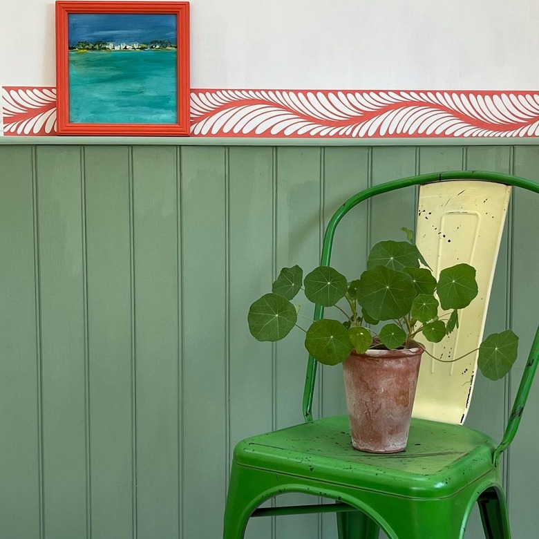 Luxury wallpaper design brand Fiona Howard Wallpapers uses its Sway Border in the color Tomato to complement the green wall. "If you [don't have] the time for a full redecorating project, then consider a wallpaper border as a quick, fun, and economical solution to update your room," the brand writes in an Instagram post.