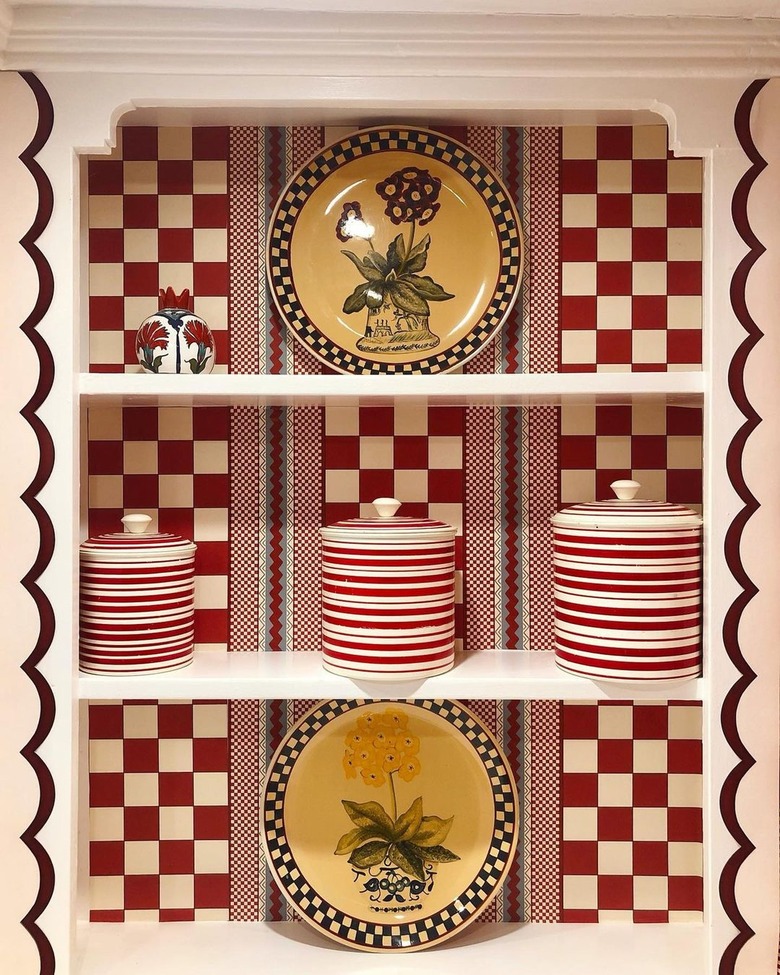 Ottoline de Vries, founder of London-based Dutch design house, Ottoline, created playful wallpaper borders that are demonstrated in spaces beyond just the walls of a room. As shown here, the border is encasing a kitchen cabinet to add some additional charm to a storage area.