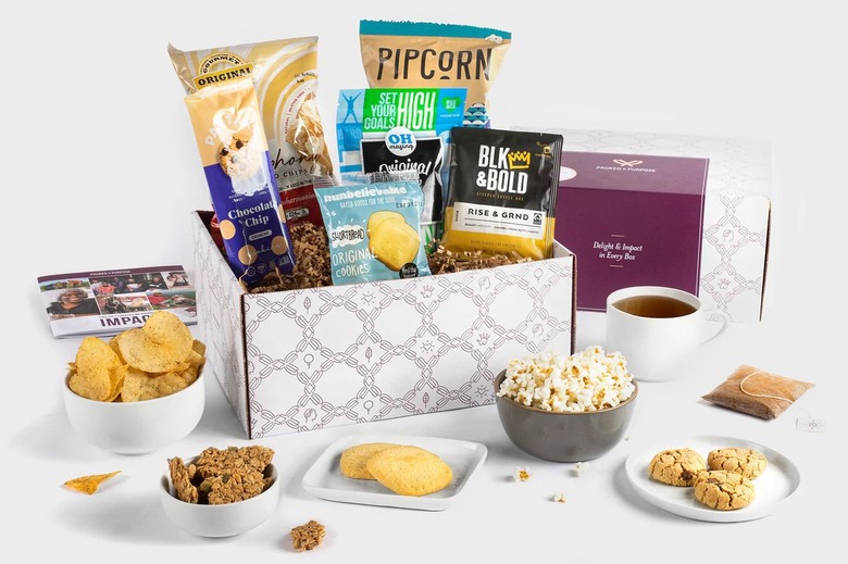 The Black-Owned Spotlight gift box contains a variety of treats, foods, and coffee from various Black-owned businesses. Each featured brand supports causes and individuals, including the Food Equality Initiative, domestic youth, agricultural biodiversity, employment training, healthy lifestyles, and meal donations.