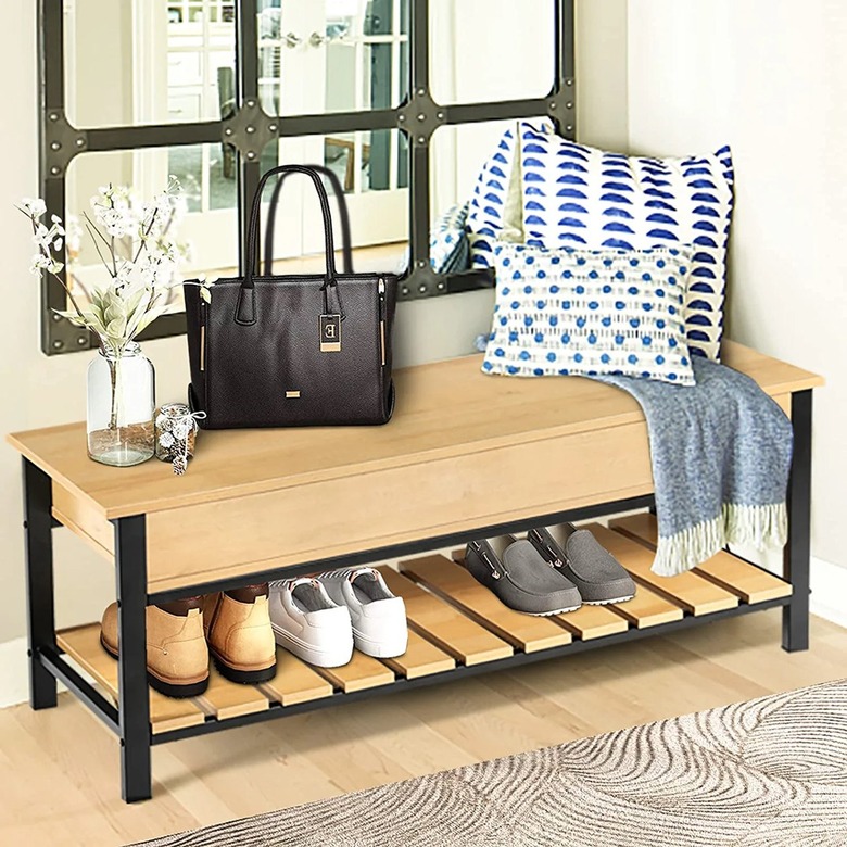 If you have a more industrial style, this affordable storage bench is for you. With both a hinge-top bench for hidden storage and an open rack for shoe storage, we think this piece of furniture is best suited for an entryway or mudroom.
