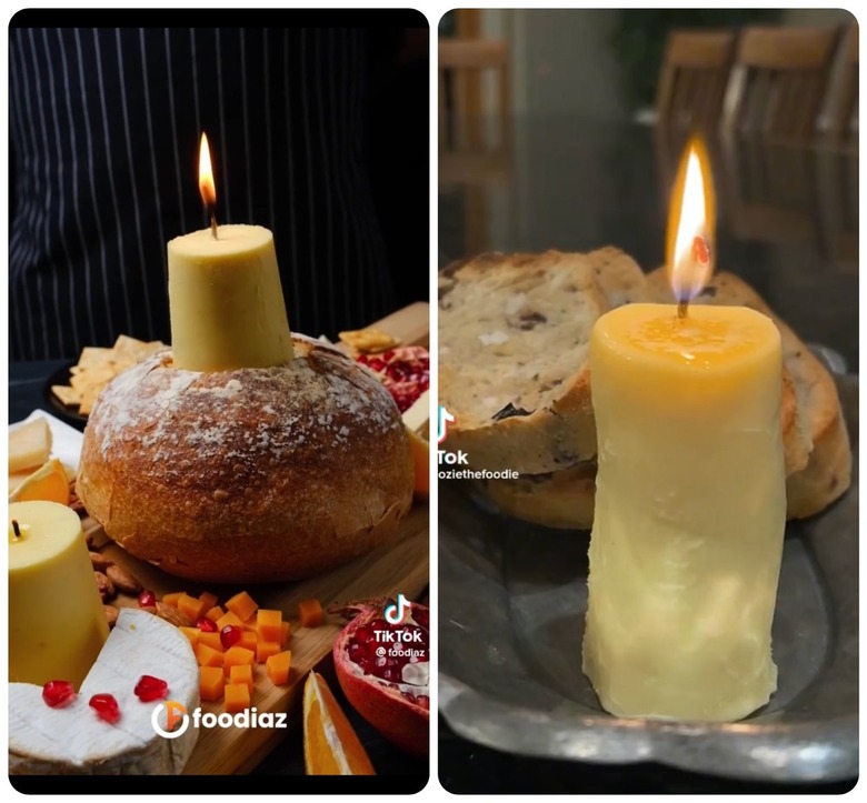 Once it's lit, the butter softens and melts, creating a deliciously ambient centerpiece for your holiday table that is edible and perfect for dipping slices of bread into. You can place the butter candle on a serving dish, or opt for putting it directly on top of a loaf of bread, as TikToker @foodiaz does.