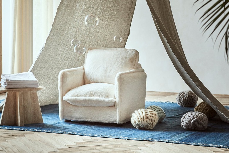 - The chair arrives dressed in a cotton linen slipcover (available in three colors: white, blue, or pink) with a second slipcover made of recycled faux fur (available in a light tan or a darker brown).