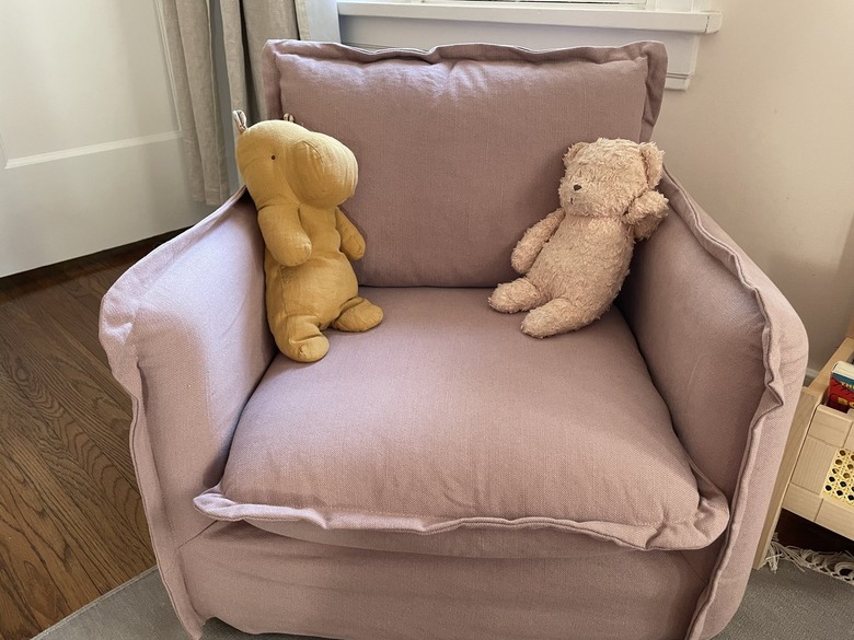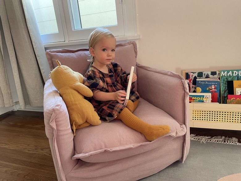 For my daughter, Eleanor, I chose the pink base and the light tan fuzzy cover combo. The delivery was easy — there's no assembly required and while I could have carried the chair myself (it is pretty substantial at 40 pounds), the delivery person placed it for me. The quality of the chair is apparent right away between the beautiful French seams and the sturdy fabric. I've felt nothing but joy for this product since it's been in my home — we've moved it from a living room corner to my daughter's room it looks great in both. (In fact, seeing how sweet the Neva looked in our living room, I'm now wondering if we need the Neva daybed in that spot for cozy cuddles.) I wasn't such a huge fan of the fuzzy slipcover (more on that below), so we've left it with the original pink base. We now refer to the Little Neva as Eleanor's "princess chair" because it's just too cute and special.