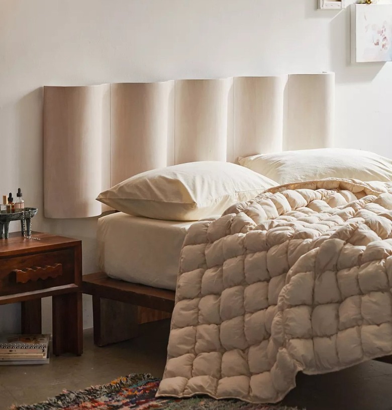 Minimalism doesn't have to mean boring. We love the wavy form of this wood headboard that catches the light beautifully. Just be aware that it needs to be mounted to a wall rather than attached to a bed frame — but that just means you can one day repurpose this headboard as a wall sculpture!