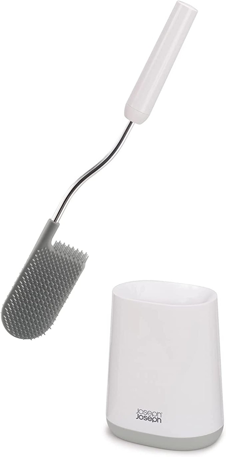Thick silicone bristles are a little easier to clean than traditional ones when it comes to toilet brushes. We love that this one has a unique D-shaped head that allows you to clean under the toilet bowl rim with ease. Plus, its holder is nice and slim so as to save valuable space.