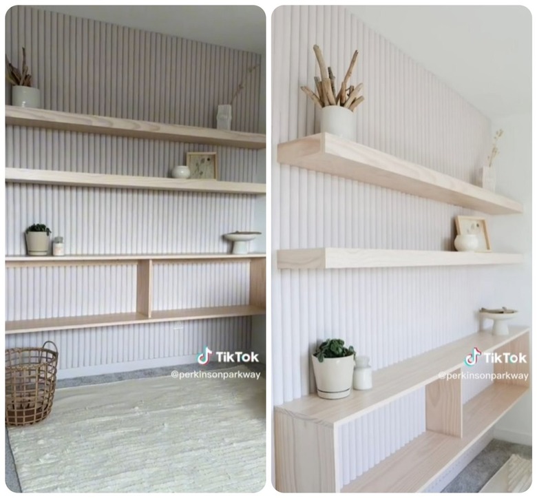 The wall was created by TikToker @perkinsonparkway, who cut PVC pipes with a table saw. This allowed her to place the pipes around floating shelves, which she already had installed in the wall.