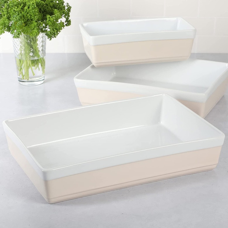 9. 3-Piece Oven to Table Stoneware Bakeware Set in Pink
