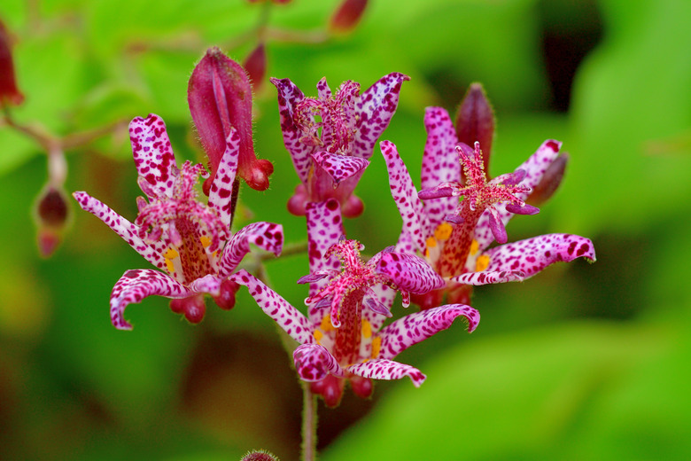 Not technically a "true lily," toad lilies have distinctively delightful, 2-inch spotted blooms resembling orchids. Unlike orchids, though, these plants grow on leafy shrubs that are beautiful in their own right, especially the species with variegated leaves. These shade-loving, moisture-craving plants bloom in early fall, long after many flowering plants have gone dormant.