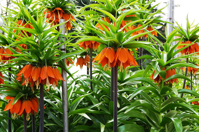 These bulbs grow similarly to other lily species, with a long, straight stalk adorned with leaves. What makes the crown imperial distinctive are its downward-facing flowers that bloom below a crown of foliage.