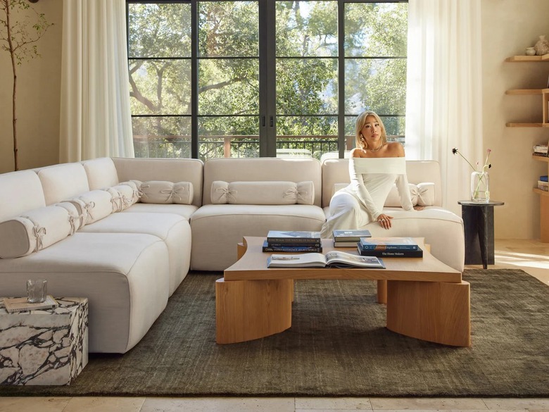 The Lulu and Georgia x Eny Lee Parker collection is composed of warm wood pieces like the Lu Coffee Table, Elle Sideboard and Dining Table, and Cami Bar Cabinet. It also includes creamy white and light blue sectionals, chairs, benches, and ottomans, along with classy tableware sets and vases.