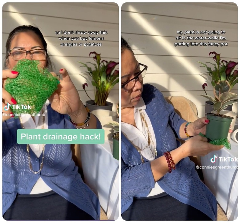 TikTok user @conniesgreenthumb shows us a brilliant (and free) way to add drainage to your plant pots by using upcycled mesh produce bags: