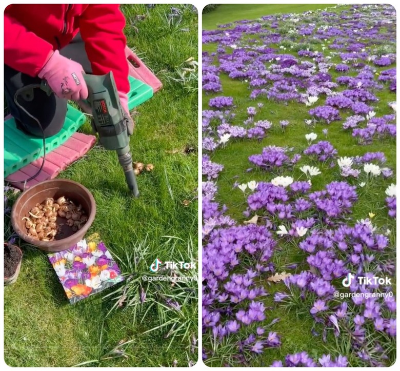 To better explain her method, Gardengranny posted an instructional video with the specifics. She uses a 10-inch-long, 1 1/2-inch-wide drill bit (she shared this similar one on Amazon) to drill down a few inches into the ground, drops in the crocus bulbs, and fills the holes with soil.