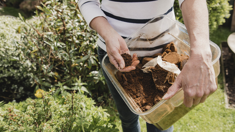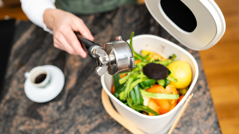 Instead of tossing your used coffee grounds into the trash or directly onto your tomatoes, a much better use for them is as a main ingredient in your compost bin. This is not only a great way to reuse kitchen waste, but coffee grounds release nitrogen to keep your compost warm, which is essential in breaking down the rest of the organic matter. It's important not to overdo it though. Coffee grounds should only make up 20% of your total compost. If you don't drink enough coffee to achieve this ratio, many coffee shops and restaurants give away their spent grounds for free. While you're at it, you can also toss your coffee filters and any leftover brewed coffee into the compost bin.
