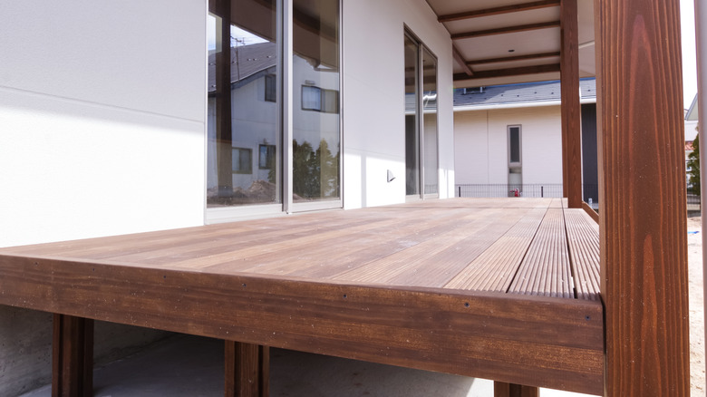 Splits and cracks along wood's grain are usually not a cause for concern, but they must be inspected to determine the nature and severity of the problem. If you see splitting across the wood's grain, however, or long areas of gray mold or darker wood, it could be a sign of rot caused by brown-rot fungi, or dry rot. Termite activity is also a sign of dry rot. Dry rot destroys decks quickly and must be stemmed immediately, and a deck suffering from it should not be used until the fungus is remediated and an inspector gives the deck's condition a thumbs-up. Problems with gutters, sprinkler systems, flashing, plumbing, and other issues can also contribute to other kinds of rot. Any resulting damage should be corrected, and the cause identified and eliminated.