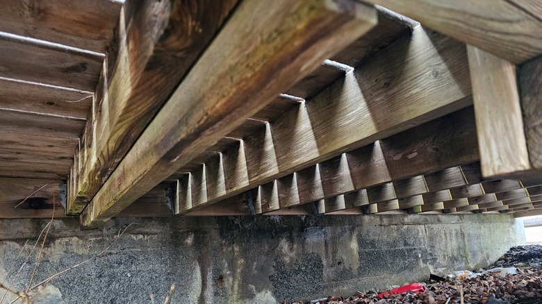 Also familiarize yourself with the appearance of galvanized and stainless connectors and fasteners. While it's unlikely to be a problem for stainless joist hangers, for example, using stainless nails with galvanized hangers, or vice versa, can lead to electrolytic corrosion between the two metals that will definitely degrade galvanized hangers. If you see, or think you see, signs of mismatched connectors and fasteners, or if you see substantial corrosion, call in an expert to replace them with properly matched components. Corroded fasteners can also cause deterioration of the wood they're sunk in, so be on the lookout for signs of damage to the boards around corroding nails or screws.
