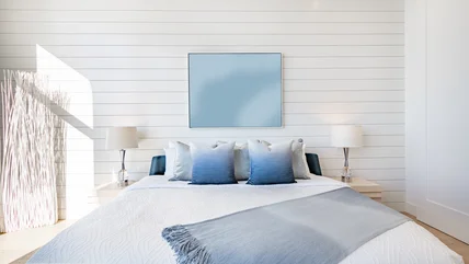 Once your panels are cut, find and pre-mark the studs to make things go quickly. Installation of the panels is as simple as holding the panel up on the wall flush to the baseboard, making sure it's level, and using a nail gun to secure it to the studs. Repeat for the remaining panels and top the entire accent wall with a 1x4 board if it does not go all the way to the ceiling. If you plan to paint it, you can use primed MDF, but if you plan to stain it like on TikTok, opt for a hardwood like oak. Patch and sand all nail holes and seams, then prime and paint your DIY shiplap project. And there you have it: an inexpensive, easy, and gorgeous shiplap-inspired accent wall that adds texture and farmhouse charm to your bedroom without the hassle or cost of traditional shiplap.