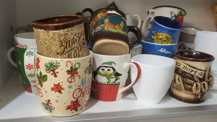 The first step towards an organized mug cabinet is decluttering as much as possible. Toss any chipped or broken mugs and store seasonal offerings with corresponding holiday decor so they don't take up space year-round. Mugs are often the most difficult of the kitchen crockery to declutter because they can have sentimental value. If there are mugs you never use but don't want to donate, simply store them somewhere else. These include mugs you got on vacation that are too small for practical use, or delicate tea cups handed down from your grandmother. Keep them in the attic, or on display in a china cabinet. Once you've whittled the selection down to mugs you actually use, it's time to start stacking!