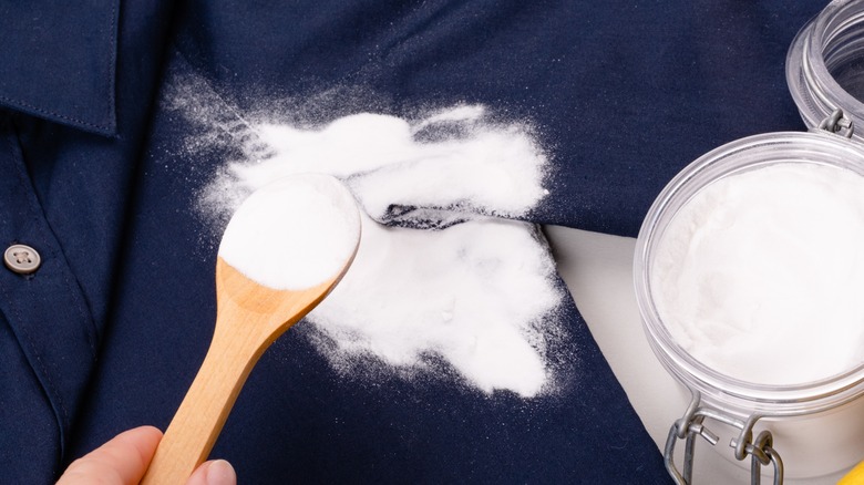 Picture the scene. You are frying up some bacon before heading out the door. The heat is up a little too high and grease starts splattering out of the pan — and directly onto your favorite outfit. You need to act quickly before the stain sets, but you don't have a lot of time to spare, especially since you have to change outfits. All you need is a little baking soda to continue with your day as planned. Of course, stains don't always conveniently attack while we are at home, like when you spill salad dressing down your front at a work lunch. While it is best to tackle these stains right away, you don't have to chuck your clothes in the trash. Grease and oil are some of the toughest stains to get out of clothes because they don't break down in water, but with a few household items like baking soda, there is hope.