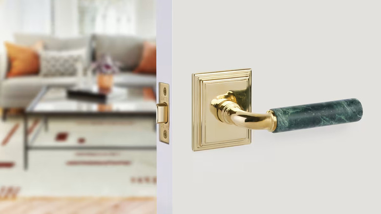 Lean into your organic side by using fun doorknobs or levers made from stunning natural stone or crystals. Adding an unexpected hit of opulence, these of-the-Earth materials give a high-end, unique look to the space while still feeling grounded in nature. Whether the knobs themselves are made of the material or it's simply inlaid within other metal elements, this upscale earthy door hardware will not go unnoticed.