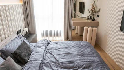 Once you've determined the mattress size that's appropriate for your bedroom, balancing out the large bed with other appropriately-scaled furnishings is essential. To increase the visual scale of the small room, look for grander headboards to give the illusion of more space. Or try running a headboard wall-to-wall behind the nightstands to make the space appear wider and more streamlined. Go as wide as possible with the nightstands, as you do not want them to appear diminutive compared to the bed, but be sure to take fluffy bedding and baseboards into account before maxing out your width so it isn't too tight of a squeeze.