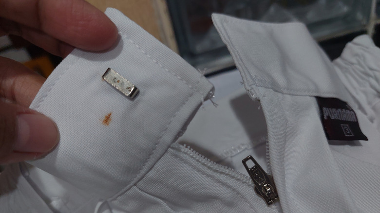 Like other bright-colored stains, rust can be challenging to treat in clothing. One alternative to commercial stain removing products is a white vinegar and table salt combination. White vinegar helps to lift the stain, while the abrasiveness of the salt can help remove the rest of it. The key is, as with most other stains, is to begin treatment as soon as you notice the rust spot for the most positive outcome possible.
