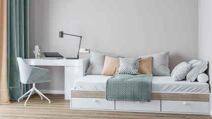 Because floor space is often at a premium in secondary bedrooms, think vertically and take advantage of off-ground options, such as floor-to-ceiling storage cabinets, open shelving for books or display, or floating organizers inside a closet. Depending on your alternate purpose for the space, consider multi-functional furniture like a wall-mounted fold-down table. Another space-saving storage idea for small bedrooms is to create built-ins to streamline the space and blend it in seamlessly as an integrated feature of the room. For example, float a desk between large full-height cabinets or add a custom window seat with storage drawers below for extra seating and concealed organization.