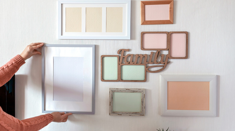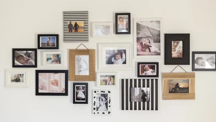 If you decide to keep the photos around, but you also want a way to make them a bit more organized, less chaotic, or just more cohesive, there are a ton of solutions. One of the simplest is to invest in a digital frame. This will display selected photos on a cycle, and it is usually easy to add or remove them as you wish. If you already have a smart device with a screen, like the Amazon Echo Show, you can also program that to show your photos in a similar manner. If you're very much set on actual wall photos, though, consider a gallery wall: This option allows you to lean into the uniqueness and choose photos of all sizes, and display them in different ways — framed, matted, tucked into a mirror — with the goal of crafting something personal and curated. That said, don't place photos randomly on the wall, either: You want the size differentiations to look nice and feel fitted together in a way that complements the photos, instead of taking away from them.