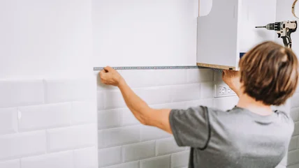 To create your own IKEA MOSSLANDA kitchen ledge, determine the starting point. If there is an open end where the tile terminates on an open wall, begin installing your shelves on this side for a finished visible edge. Use appropriate fasteners for your substrate, locating the studs with a stud finder prior to drilling. Instead of installing the shelf as a picture ledge with the U shape facing upwards, flip the shelf upside down. Resting the shelf on top of the tile and ensuring it is level, mount it to the wall. Butt the next shelf against the first and repeat the process until you reach the last shelf.