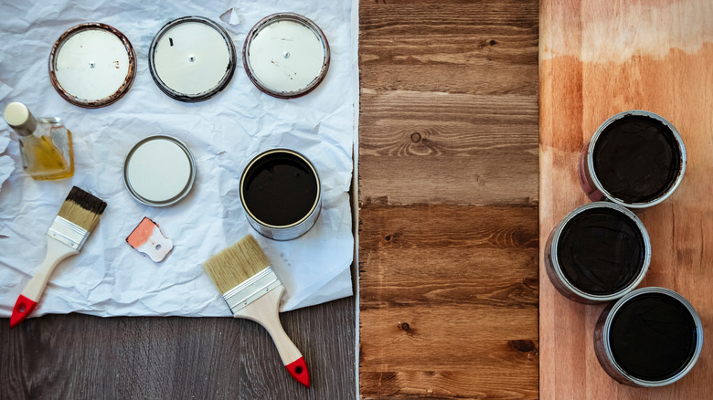 Applying the glazing is simple. First, gather your supplies. Here's my budget-friendly list: a roll of shop towels, three or four inexpensive foam brushes, a container of mineral spirits, and latex gloves to keep the stain from your fingers. Because you're using oil stain and mineral spirits, do your glazing in a well-ventilated area. Choose the color of stain you wish to use. Whether it is a painted surface or a varnished wood surface, I recommend a stark difference between the existing hue and your glazing stain.