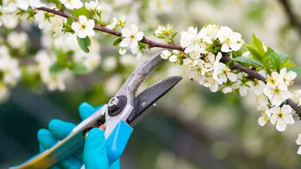 Any time you're pruning or trimming plants, be sure your tools are sharp and sanitized so they're making clean cuts all the way through the branch. Also, try to cut as close to a 45-degree angle as possible to help the plant heal faster. After pruning, put down a layer of compost or other fertilizer to send your plants into their growing season with the nutrients they need. Now, what else needs snipping?