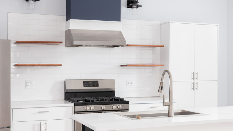 Of course, floating shelves do not actually float. They are shelves that have no visible exterior support. There is some great hardware for hanging floating shelves and you can even make your own DIY cleats to help you make it happen. And installing a floating shelf is surprisingly easy. Two prime areas to consider for floating shelving is at the end of a run of upper cabinets; the other space would be between two upper cabinets, perhaps over a sink. Let's go over the fast and easy approaches to get this done.