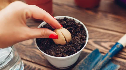 To germinate an avocado pit from store-bought fruit, Martin said to "Wash the seed thoroughly, and let it completely air-dry overnight, then gently use a knife or your fingernails to peel the brown skin off of the seed so that only the white part is visible." She advises against the toothpicks-and-water method you might have used as a child and opts for using soil instead. "Fill a pot nearly full with potting soil and stick the pit into the dirt only halfway, with half of it visible" she said, adding: "Water deeply."