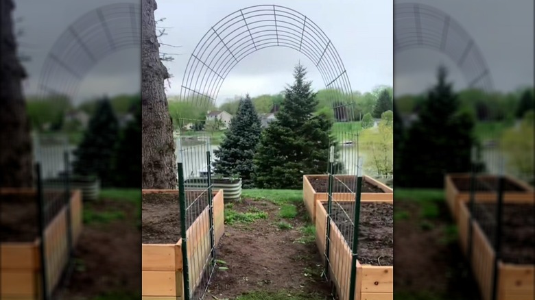 Follow an idea from TikTok to make a stunning curved trellis using a cattle panel and four T-posts. Cattle panel is typically 16 feet long and 50 inches wide, so you'll need a truck or other form of transportation that can easily manage its size. Some T-posts come with metal clips you can use, but if not, wrap zip ties along the top, middle, and bottom to secure everything in place. The wire edges may be sharp, so make sure to wear a thick pair of gloves and smooth any rough edges with a file or deburring tool before shaping the panel. Once installed, you'll have a tough arched trellis that can hold the weight of many of your larger crops with plenty of space for them to grow and spread.