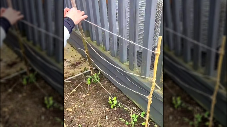 To install this easy-to-make trellis, grab a few sturdy 6- to 7-foot-tall bamboo canes, and use a hammer or mallet to drive them at least a foot deep into the soil to keep them secure. If they're placed too shallow, they can shift or dislodge from the ground. Grab some twine, and tie it to one end before wrapping it at least two times around each cane. Make sure to keep the string taut and tie strong knots so they don't fall under the weight of your vegetables. This method is best for lightweight plants like snap peas, as the support may not be strong enough to hold the fruits of heavier varieties.