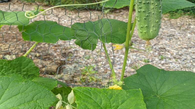 Although chicken wire has several benefits, its biggest drawback is its lack of strength. While it can support climbing vegetables when properly attached, it's too flimsy to stand on its own and needs to be secured to a sturdier frame for stability. If you have a raised bed, @edenbrothers on TikTok recommends using screws to attach the posts to the bed to better hold it in place. For gardeners working with plants directly in the ground, make sure you drive the stakes deep into the soil so the trellis won't wobble or topple over under the weight. Use zip ties to attach the chicken wire to one side, pulling tightly before securing it to the other end post. Opt for galvanized wire mesh, like Vnesovo's Galvanized Chicken Wire, as it's less likely to rust.