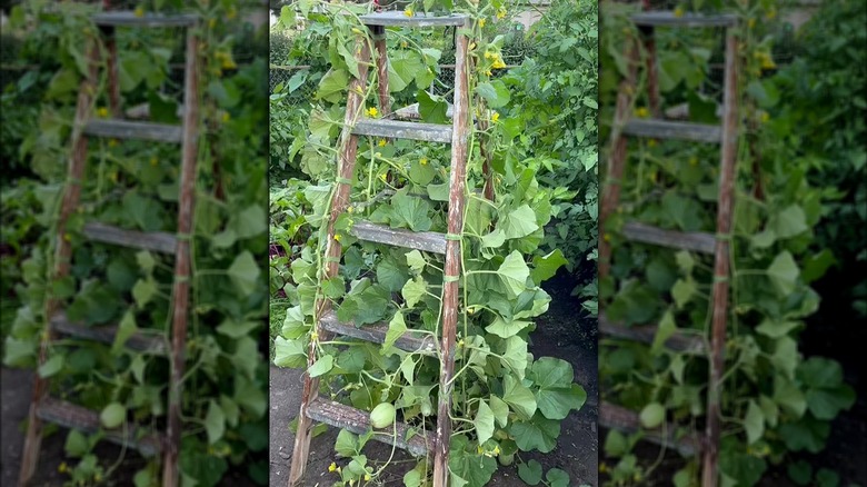 Use an old wooden ladder for your veggies to climb up