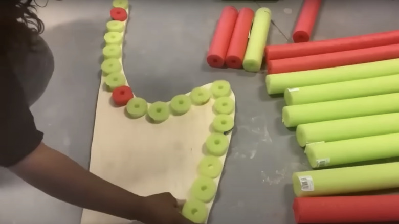 Determine pool noodle layout by laying out sample discs and tracing the inner holes for drilling