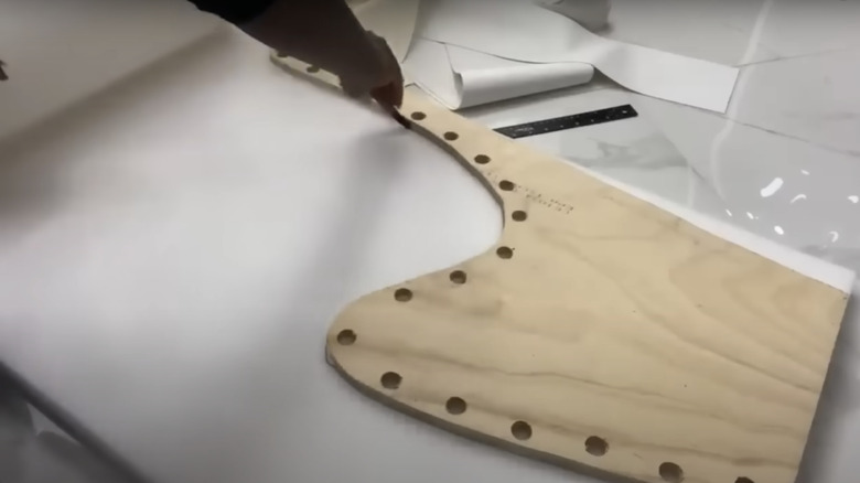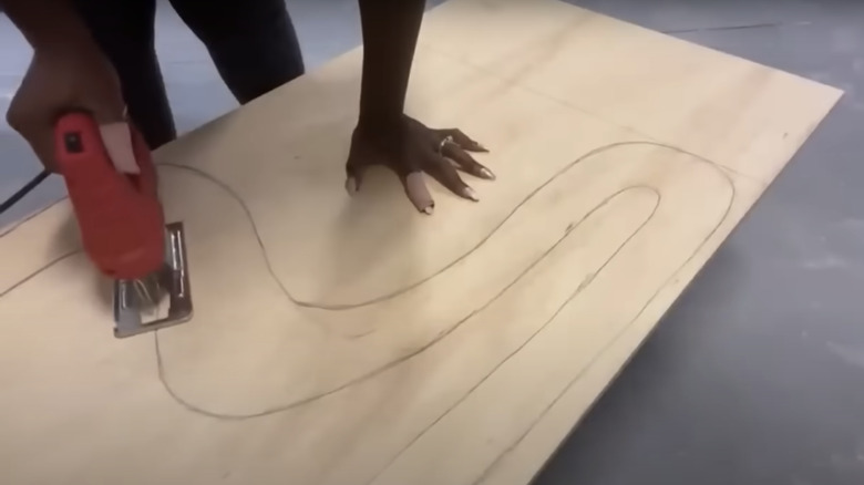 To begin, you'll need to plan out the shape of your chair by creating the two side panels that will hold the pool noodles between them. This is arguably the trickiest part of the DIY, as there are no instructions as to how Yvonne created the shape. Your best bet would be to research average proportions of chairs, such as common seat and back heights and depths, as well as comfortable pitch angles. You can also grab a measuring tape and do some practical research by measuring a chair at home that's similar in size to what you're planning. Once you have your desired sizing, measure out and connect the points by drawing a freeform shape. Take the video's retrospective advice and use a 1-inch thick plywood (instead of half-inch) to make the panels studier. Use a jigsaw to cut out one panel, then use that panel to trace and cut a second matching side. Before proceeding, use the plywood side panels to trace out a paper or cardboard template for future use.