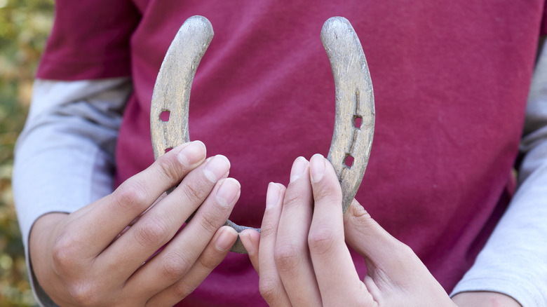 Excited to hang a lucky horseshoe but find the idea of an antique, used horseshoe a little more shabby than chic? Lucky for you, there are plenty of decorative options out there that have never been anywhere near a horse's foot. You can look for a golden horseshoe from Amazon, a personalized monogrammed horseshoe from Etsy, and many other choices. If you plan to hang the horseshoe outside of your home, be sure to find one made from a durable material that won't become damaged from exposure to the elements. And of course, do your research on how to hang a horseshoe to decide which way it should face!